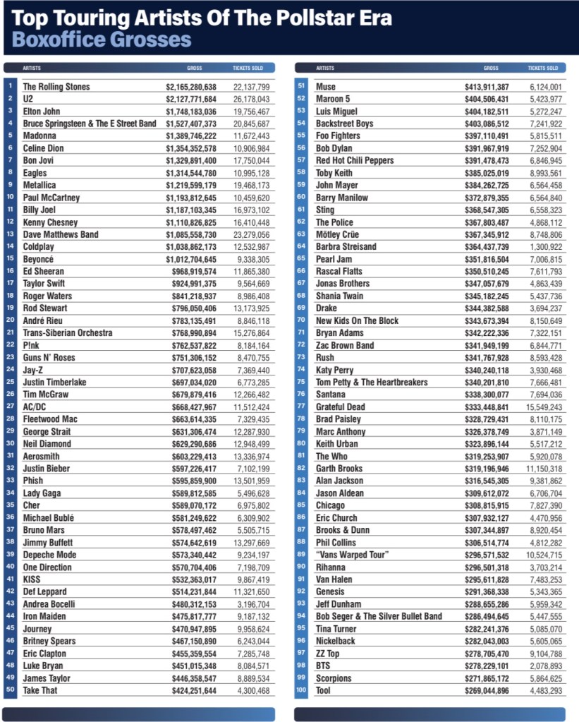 Thanks to Fred Jacobs for sharing the top moneymaking concert acts since 1980 and explaining whom the person is at number 20 that I never heard of until this week.