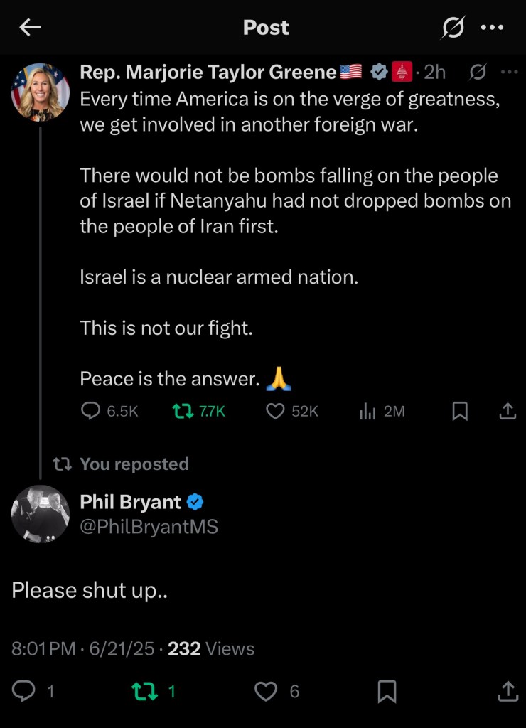 Former Governor Phil Bryant responds on X to Congresswoman Marjorie Taylor Greene (both supporters of the president) about the U.S. attack on Iranian nuclear sites.