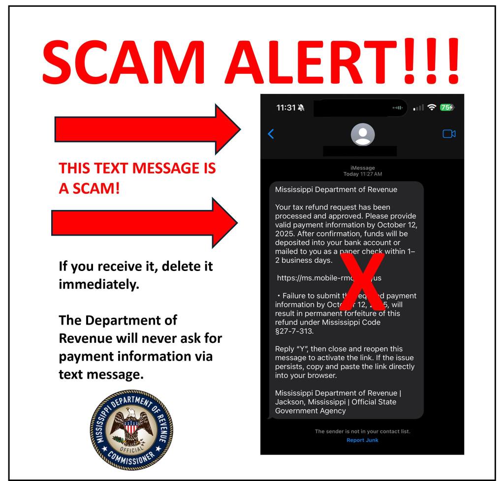 Don’t fall for it! Craig Ford news October 13, 2025 1 Minute The Mississippi Department of Revenue is warning you about a scam that may show up in your text messages. Share this: Share on X (Opens in new window) X Share on Facebook (Opens in new window) Facebook Like Loading... Related Published by Craig Ford View all posts by Craig Ford Published October 13, 2025