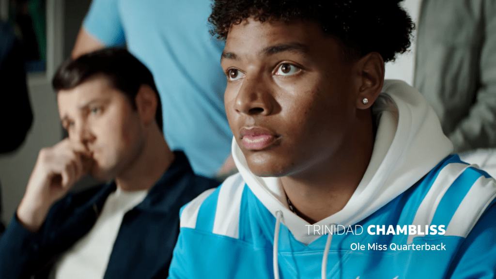 Trinidad Chambliss appears on Championship Saturday in a TV commercial talking transfer of a different kind.