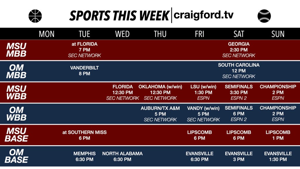 Tipoffs and first pitches Craig Ford sports March 2, 2026March 1, 2026 1 Minute All women’s basketball games will be in the SEC Tournament at the Bon Secours Wellness Arena in Greenville, South Carolina. Share this: Share on X (Opens in new window) X Share on Facebook (Opens in new window) Facebook Like Loading... Related Published by Craig Ford View all posts by Craig Ford Published March 2, 2026March 1, 2026