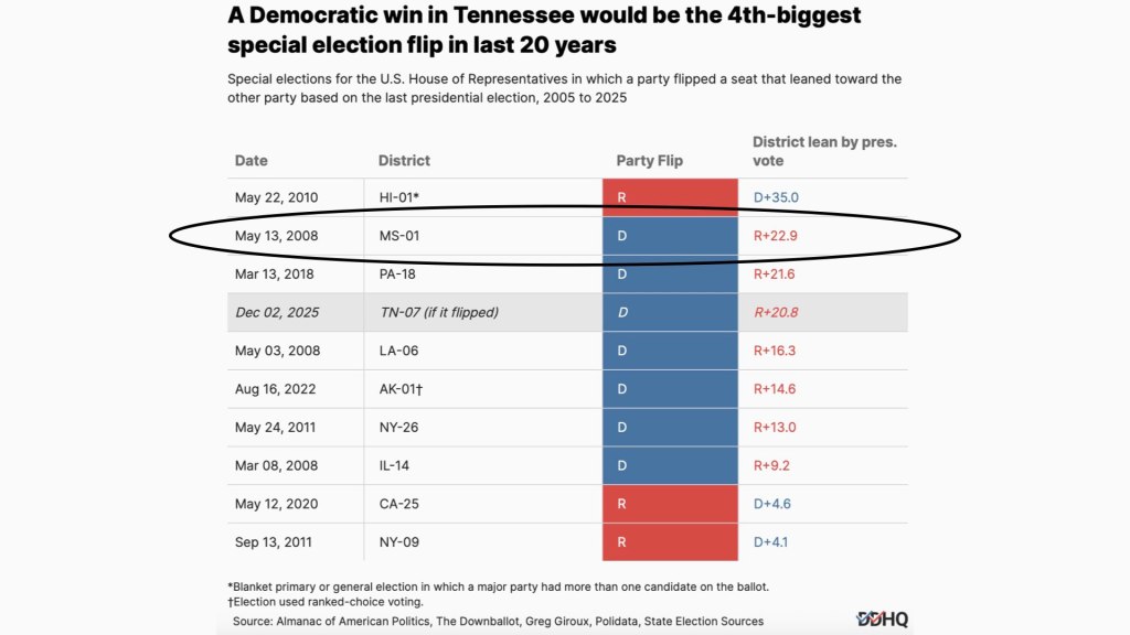 Chris Cillizza’s preview of this election included a look back by Decision Desk HQ of previous congressional special elections, and it included a huge upset locally in 2008 that got a lot of attention at the time. That’s when Prentiss County Chancery Clerk Travis Childers, a Democrat, defeated Southaven Mayor Greg Davis, a Republican, for the U.S. House seat in North Mississippi. The seat in Mississippi’s First Congressional District came open when Representative Roger Wicker was selected to replace Senator Trent Lott, who had retired.