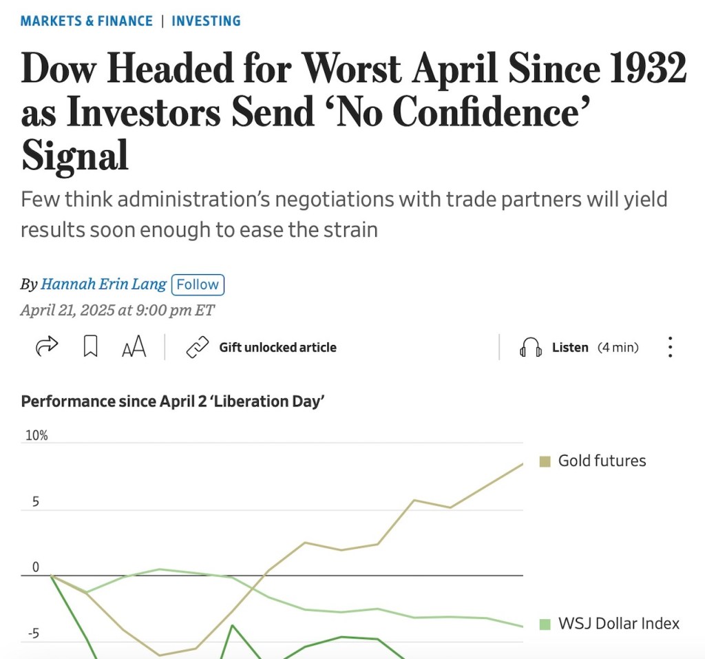 The Dow Jones Industrial Average shed almost 1,000 points on Monday and is headed for its worst April performance since 1932, according to Dow Jones Market Data. The S&P 500’s performance since Inauguration Day is now the worst for any president up to this point in data going back to 1928, according to Bespoke Investment Group.