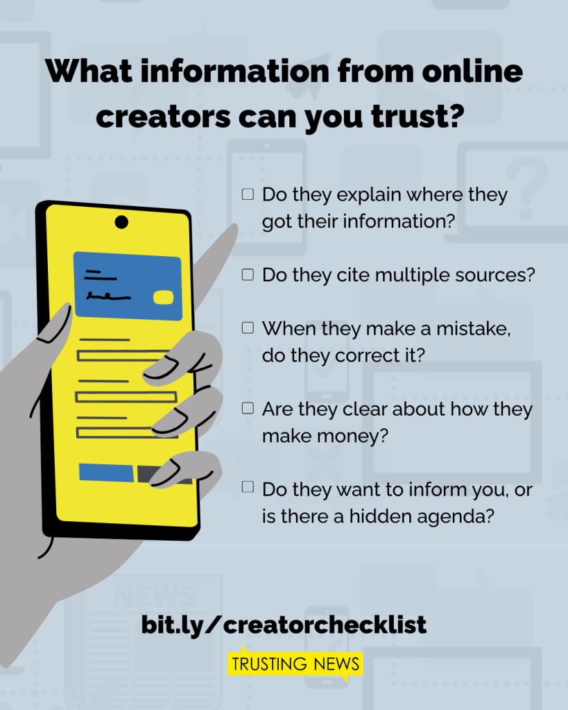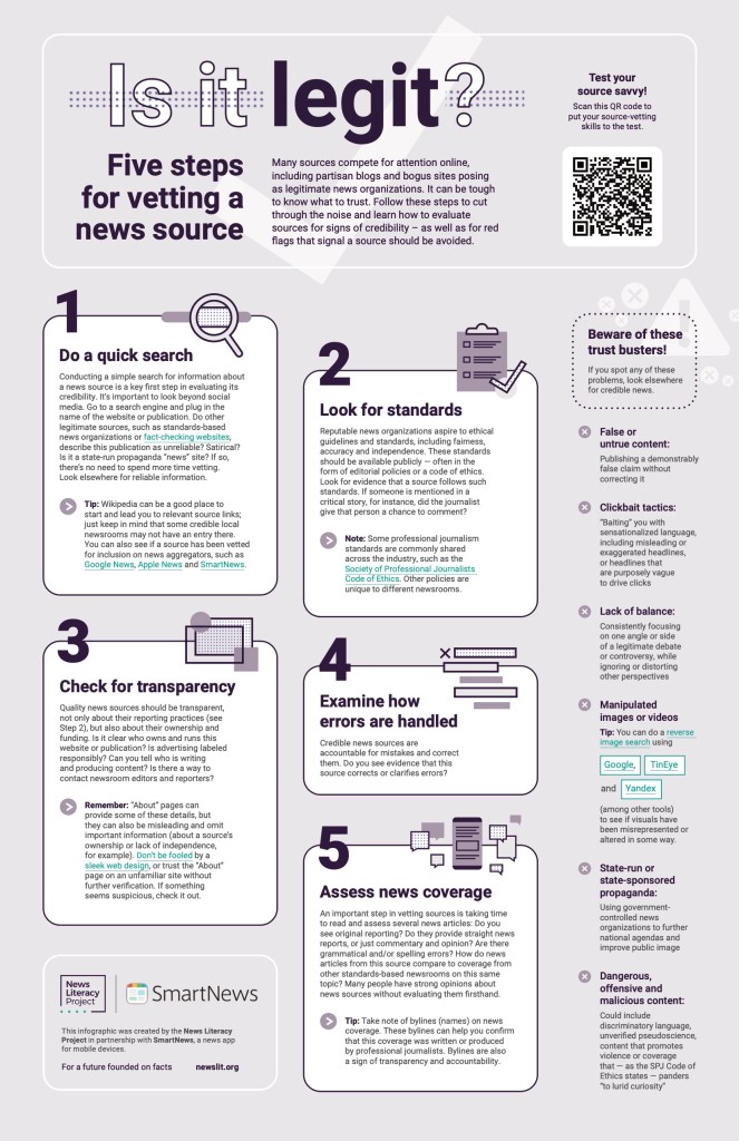Because of that erosion, the group Trusting News started in 2016 to help journalists in general get that trust back. I subscribe to the organization’s weekly newsletter, and the latest one shared checklists that reporters could share to help people decide if something they see online is legitimate. Trusting News project manager Mollie Muchna wrote the following: