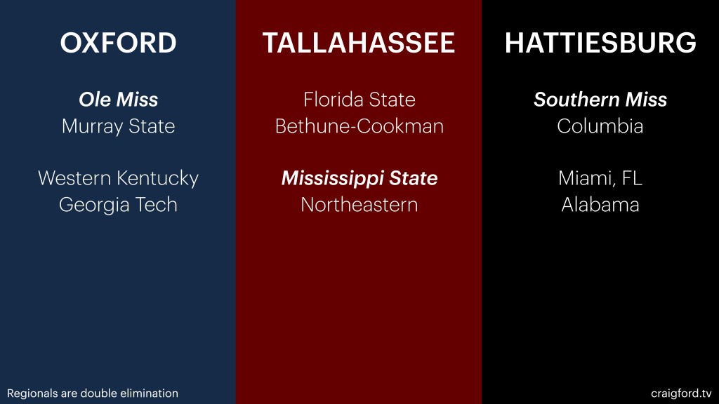 At this point, the Bulldogs, Rebels and Golden Eagles must win the rest of the way to advance to the Super Regionals. That’s not only two today but one tomorrow. Only one game today for Mississippi teams gets regular television treatment while the rest of the games will be streamed.